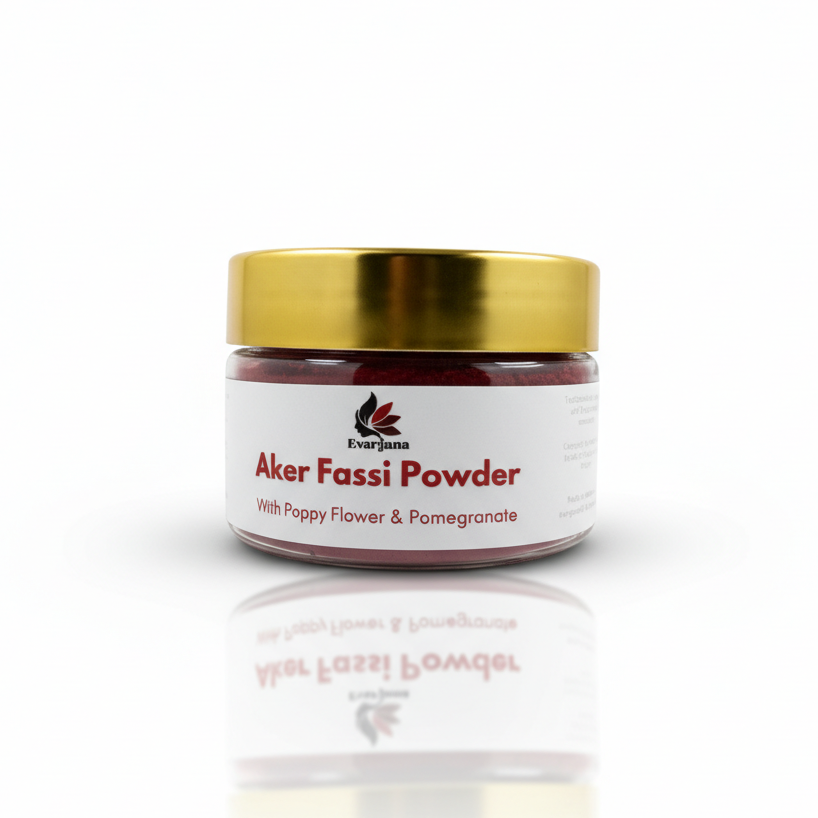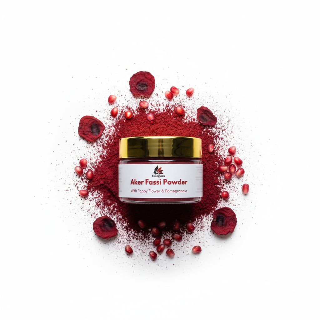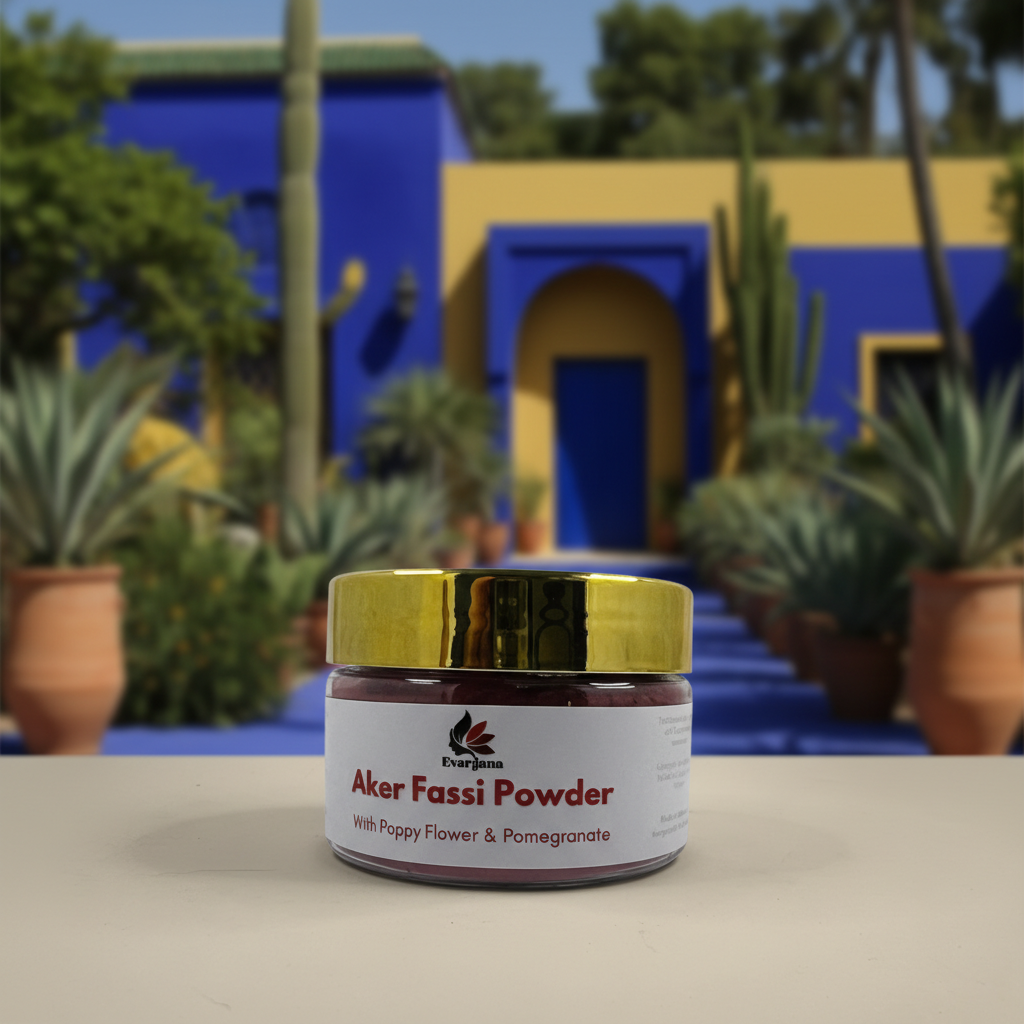 Aker Fassi ist ein traditionelles marokkanisches Schönheitsgeheimnis, das seit Generationen für Hautpflege und natürliche Schönheit verwendet wird. Dieses 100 % natürliche Pulver von Evargana wird aus getrockneter Granatapfelrinde und Mohnblüten hergestellt – ganz ohne Zusatzstoffe oder synthetische Farbstoffe.
