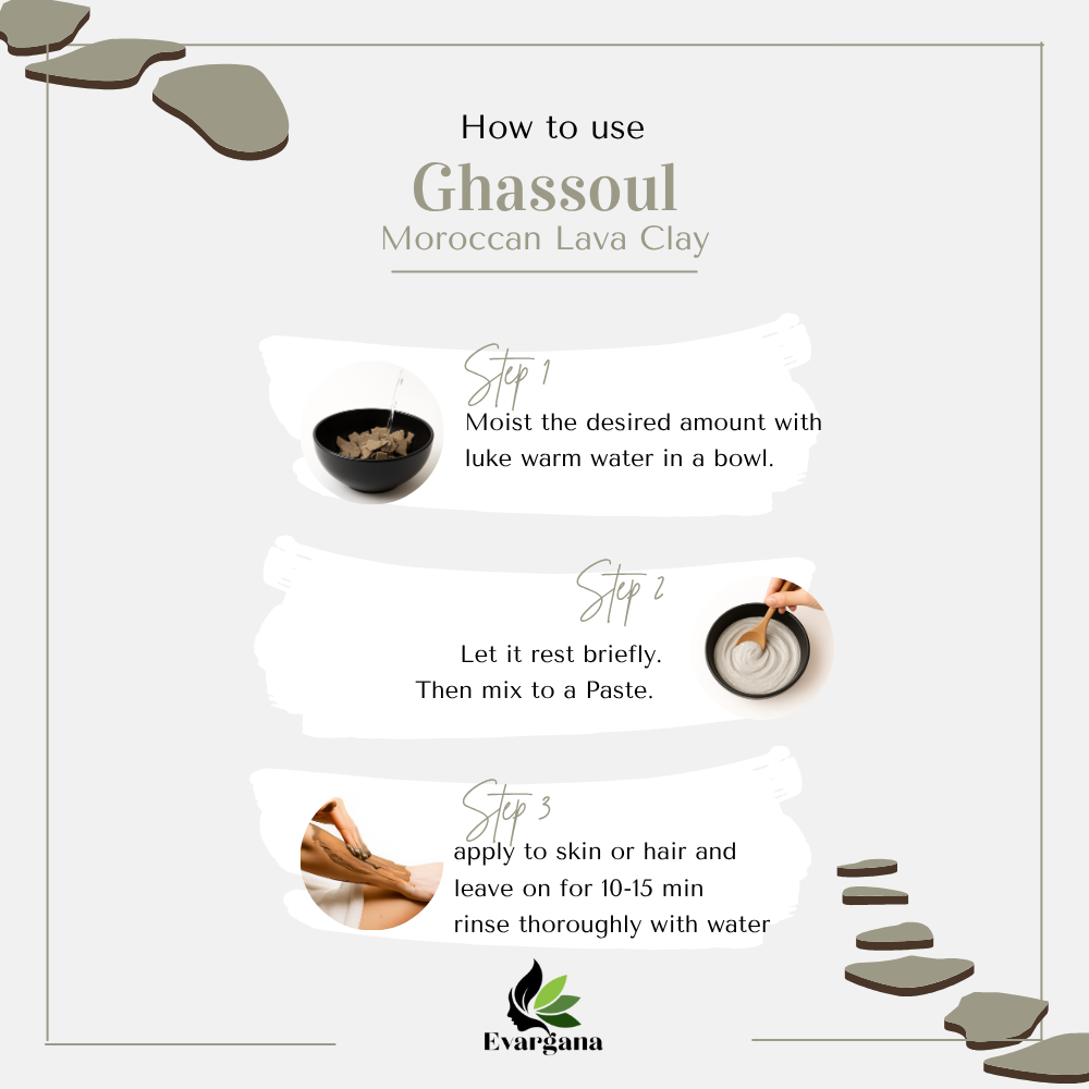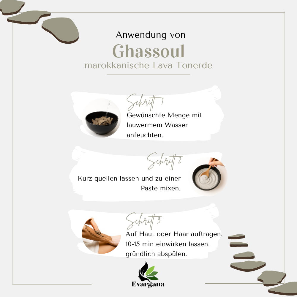 Tipp: Kombiniere Ghassoul mit Rosenwasser, Nila Pulver oder Tebrima für noch intensivere Pflegeeffekte.
